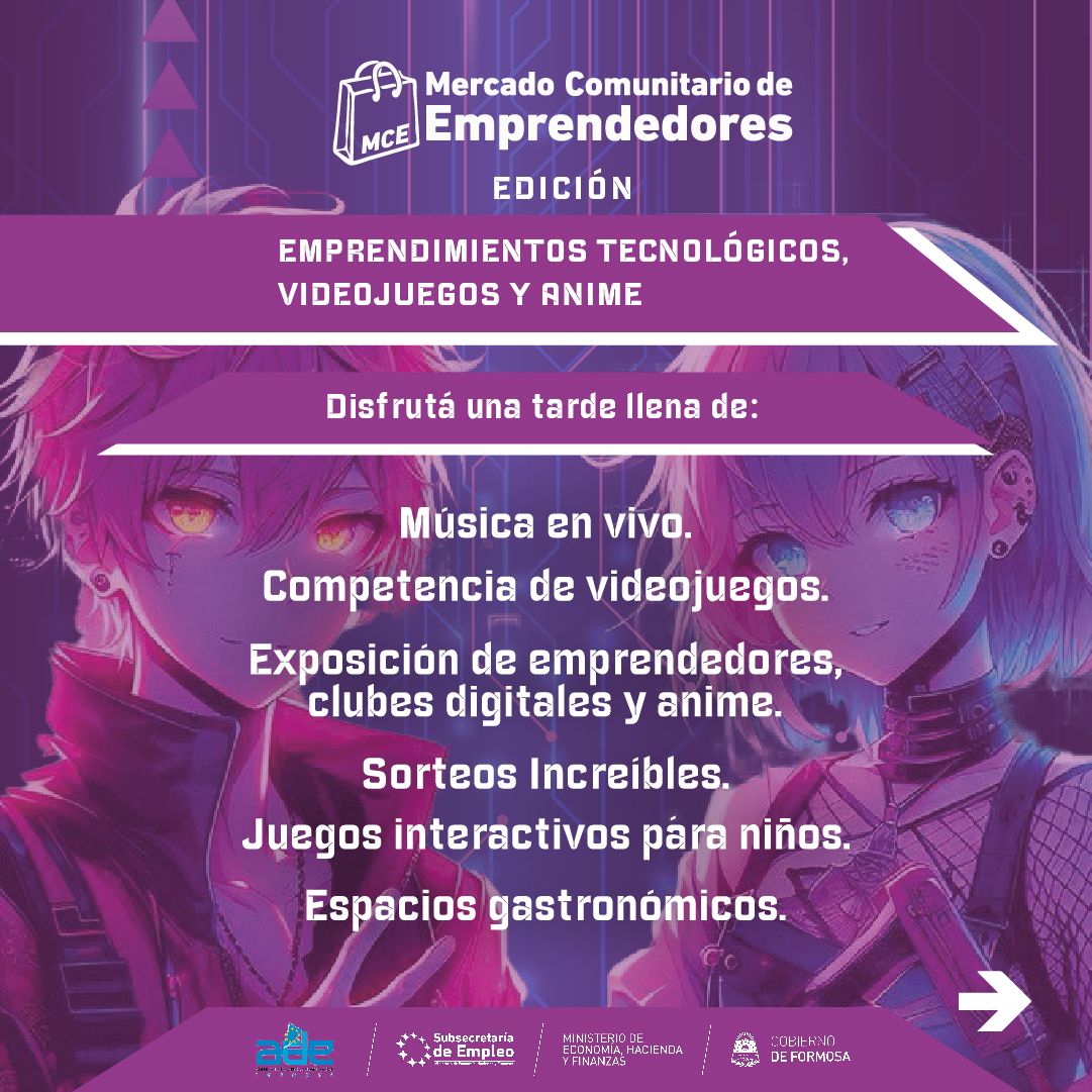 La Subsecretaría de Empleo de Formosa anunció la realización del Mercado Comunitario de Emprendedores, que tendrá lugar el sábado 20 y domingo 21 de julio de 17 a 23 horas en el Paseo Costanero ‘Galpón G’. Esta edición especial, titulada «Emprendimientos Tecnológicos, Videojuegos y Anime», apunta a fusionar ciencia, tecnología, innovación y la vibrante cultura del anime.