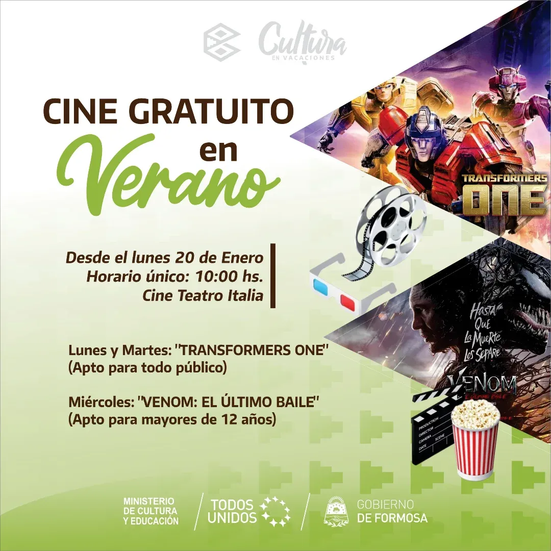 La Subsecretaría de Cultura de Formosa comunicó el inicio de las funciones del cine gratuito en el Cine Teatro Italia (Av. 25 de Mayo 383) durante esta semana. Tal como adelantó la Profesora Graciela Marechal, directora de Acción Cultural y actualmente a cargo de dicha Subsecretaría, las proyecciones serán tanto para niños para adolescentes y de forma totalmente gratuita.