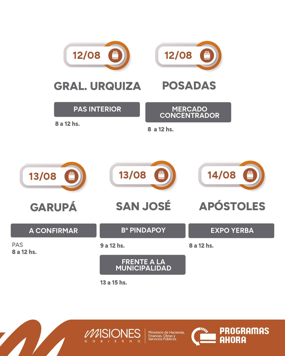 De acuerdo al cronograma que compartió en sus redes oficiales el Ministerio de Hacienda de Misiones, las garrafas del programa Ahora Gas se podrán encontrar esta semana en las siguientes ciudades: