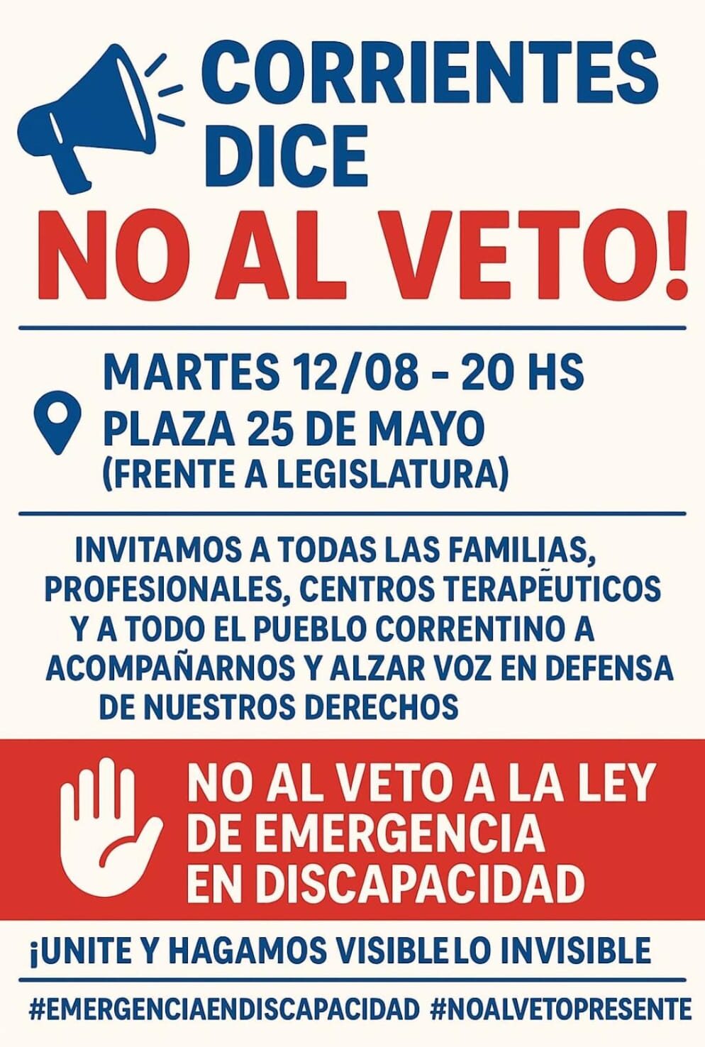 La movilización de este martes 12 de agosto en la capital correntina será parte de una jornada nacional de protesta. Con las consignas #EmergenciaEnDiscapacidad y #NoAlVetoPresente, las organizaciones llaman a “hacer visible lo invisible” y presionar para que el Congreso logre revertir el veto presidencial con los dos tercios necesarios.