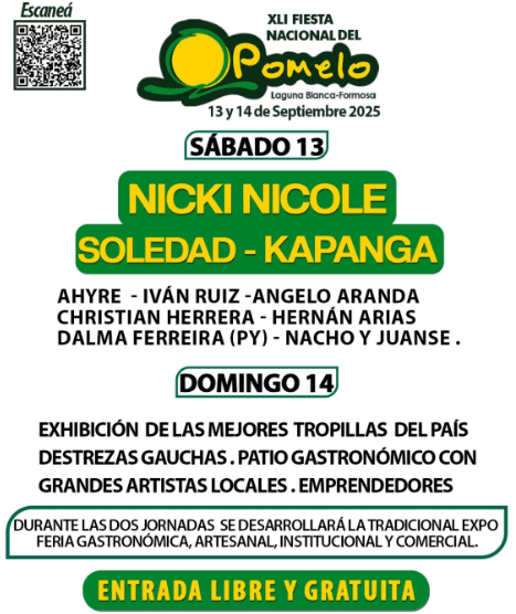 La XLI Fiesta Nacional del Pomelo se celebrará los días 13 y 14 de septiembre en Laguna Blanca, Formosa, y contará con una destacada grilla de artistas nacionales e internacionales, además de múltiples actividades culturales, gastronómicas y tradicionales.