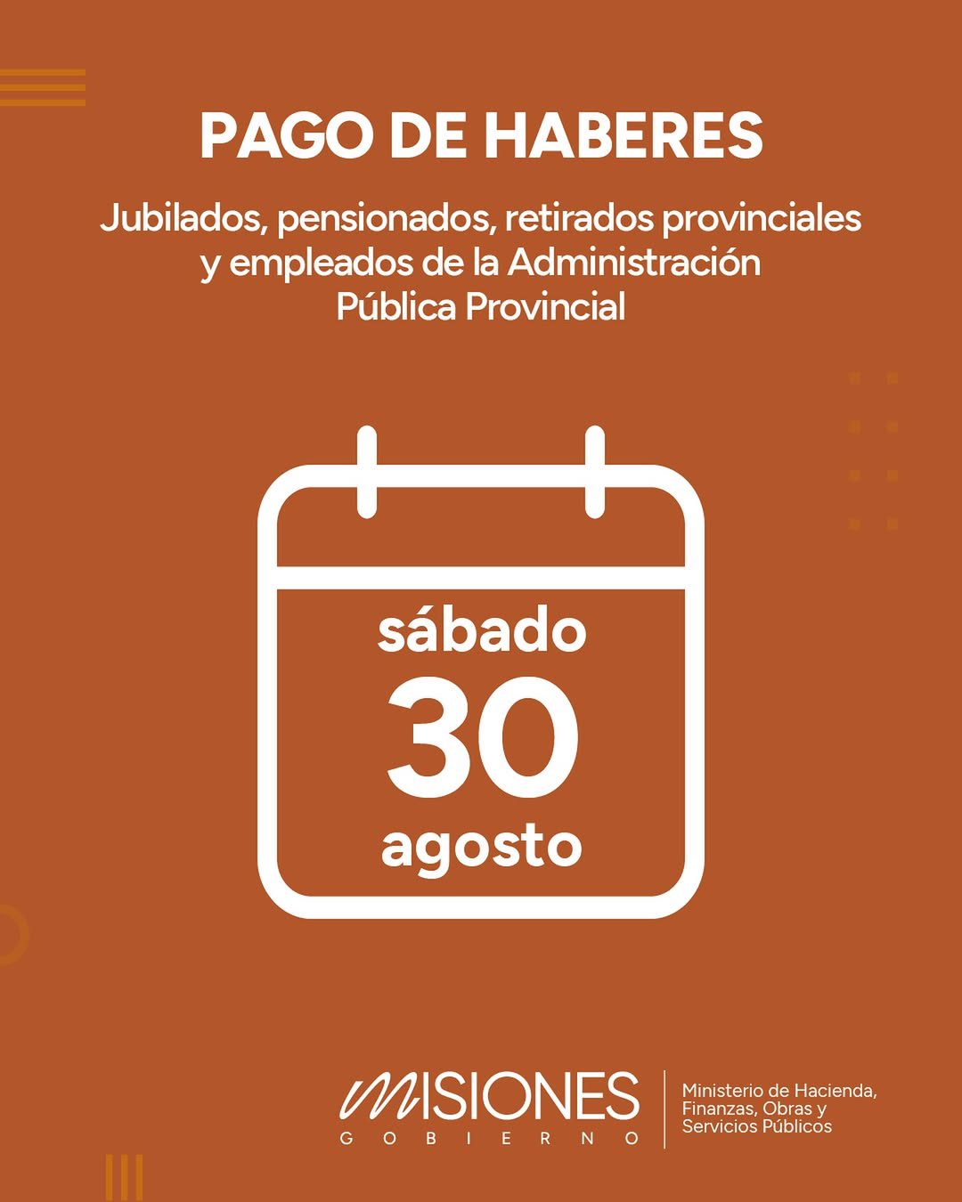 El Gobernador de Misiones, Hugo Passalacqua, anunció que este sábado 30 de agosto estarán depositados los haberes correspondientes a los trabajadores activos del Estado provincial, así como también de jubilados, pensionados y retirados del Instituto de Previsión Social (IPS).