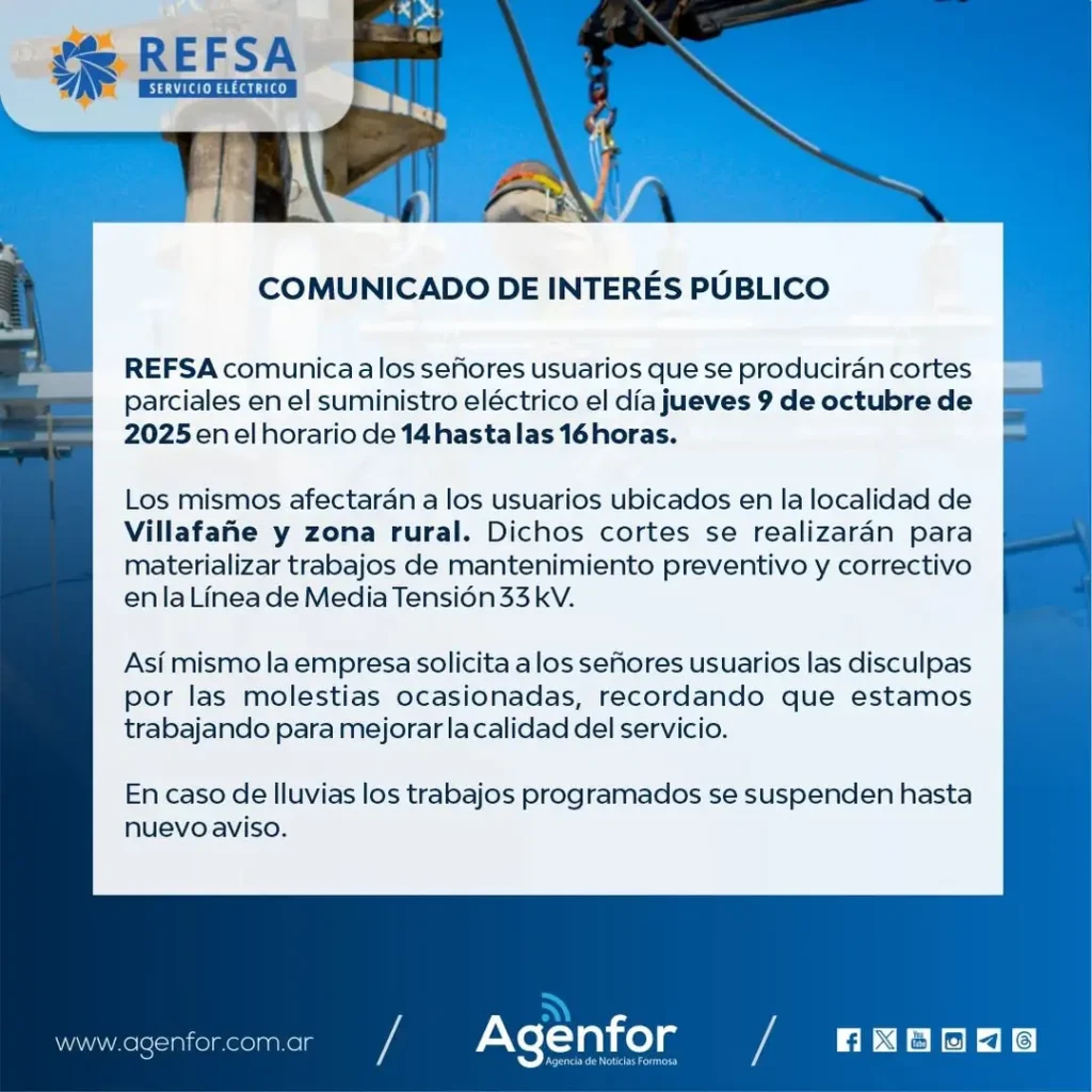 Los cortes programados afectarán a los usuarios de la localidad de Villafañe y zona rural entre las 14 y las 16 horas por lo que la empresa recomienda a los usuarios tomar los recaudos necesarios.
