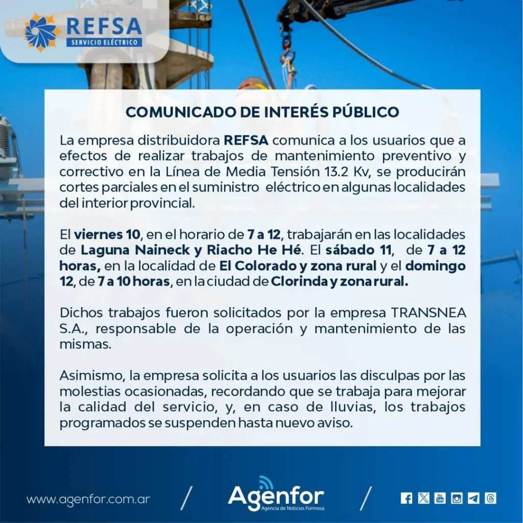 La empresa Recursos y Energía Formosa (REFSA) anunció que este viernes 10, sábado 11 y domingo 12 de octubre se producirán cortes programados del suministro eléctrico en distintos sectores de la provincia.