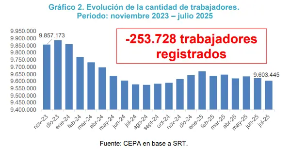 En el mismo período, la cantidad de trabajadores registrados cayó de 9.857.173 a 9.603.445, lo que representa una reducción del 2,57% o 253.728 puestos de trabajo. Esto equivale a más de 416 empleos formales menos por día desde la asunción de Javier Milei.