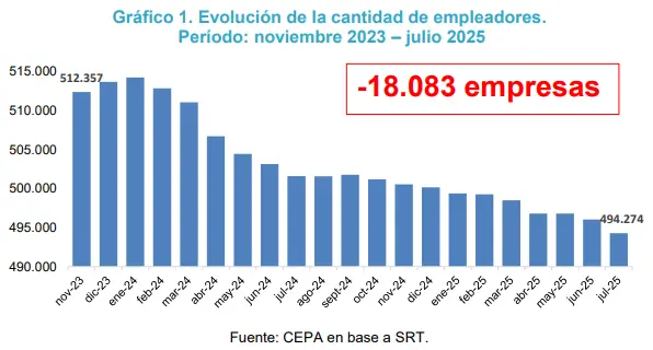 Entre noviembre de 2023 y julio de 2025, la cantidad de empleadores con trabajadores registrados cayó de 512.357 a 494.274. Esto implica una pérdida de 18.083 empresas, lo que equivale a casi 30 cierres por día (29,69). El CEPA advierte que esta tendencia “refleja un deterioro sostenido del entramado empresarial” y muestra un retroceso del 3,5% en el número total de empleadores formales en el país.