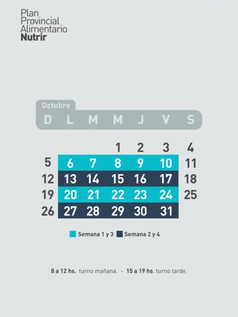 Desde el Plan Provincial Alimentario Nutrir (Plan Nutrir) que se encuentra bajo la órbita del Ministerio de la Comunidad de Formosa, informaron que esta semana los centros de distribución funcionarán con normalidad. En esta nota, te mostramos el calendario correspondiente a lo que resta del mes de octubre para que cada beneficiario pueda consultar las fechas asignadas según su semana.