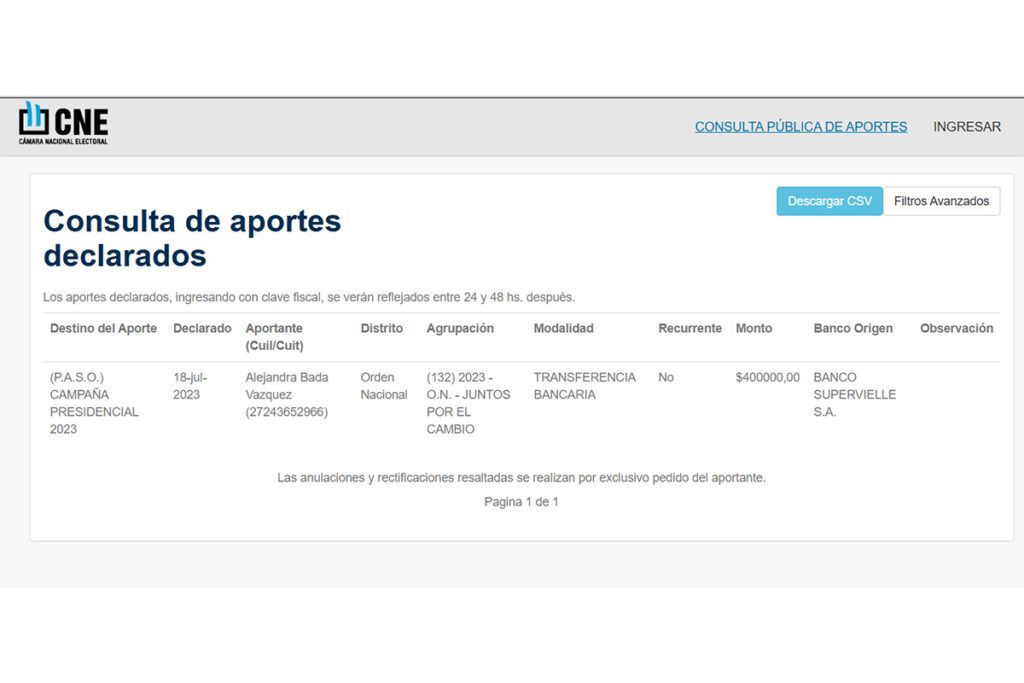 La defensa de Bullrich fue casi un espejo: «No quiero ni contestarle a Recalde. Es miente, miente, miente que algo va a quedar», dijo Patricia en un programa de televisión cuando fue consultada sobre las acusaciones. Sin embargo, el sitio oficial de la Cámara Nacional Electoral confirma que Alejandra Bada Vázquez aportó 400.000 pesos el 18 de julio de 2023 a la campaña presidencial de Juntos por el Cambio. Su nombre, apellido y CUIT aparecen en los registros públicos.