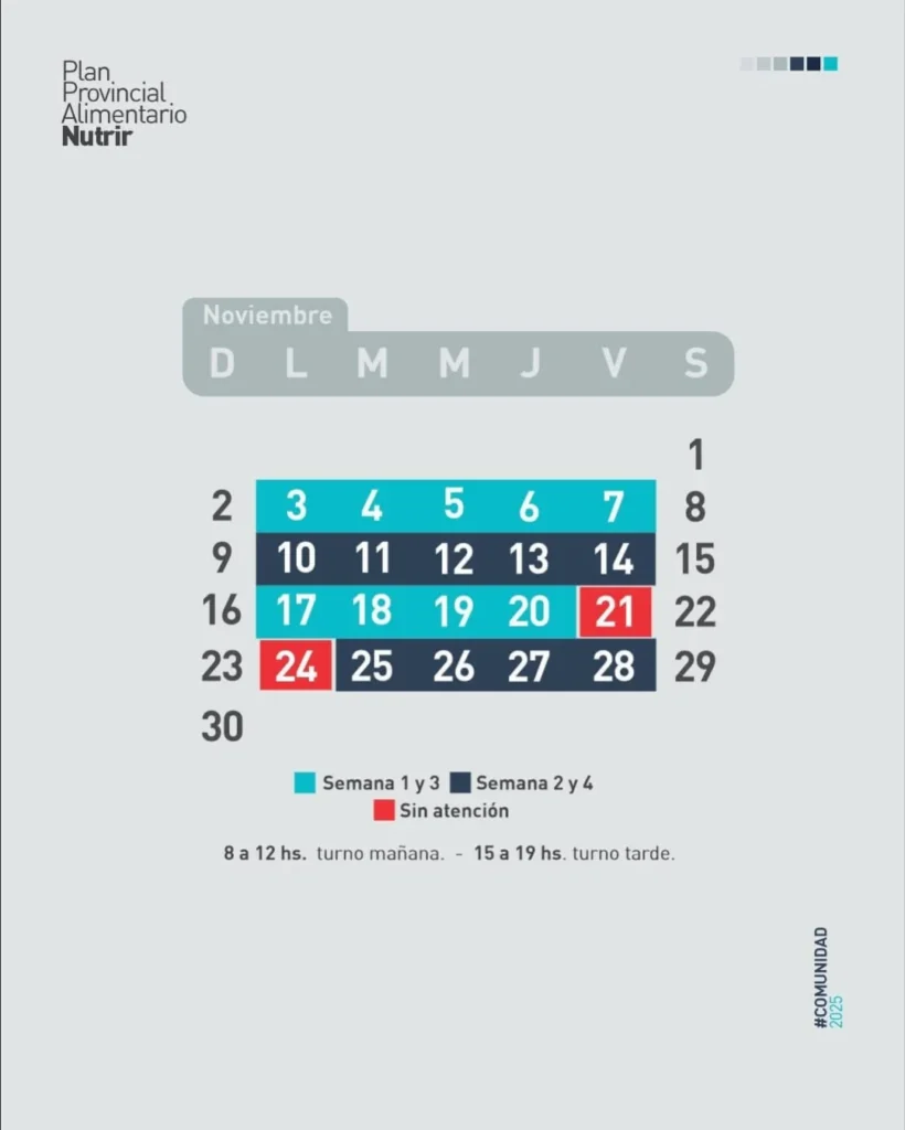 Desde el Plan Provincial Alimentario Nutrir, dependiente del Ministerio de la Comunidad, informaron que los centros de distribución funcionarán con normalidad hasta el día jueves 21 de noviembre debido al feriado, el lunes 24 tampoco habrá atención en ninguno de los centros.