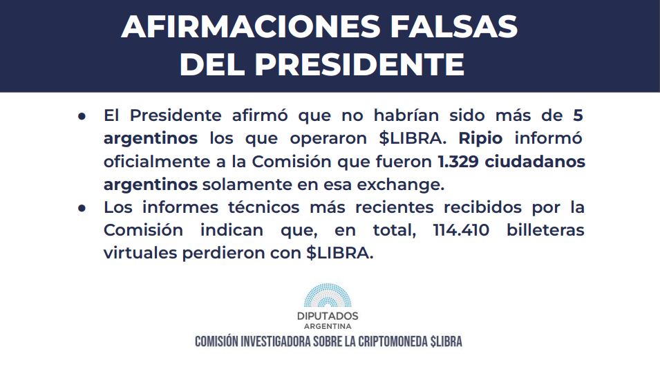 Asimismo, desmintió al propio Milei que dijo que solo hubo cinco argentinos los que operaron $LIBRA. Ripio informó oficialmente a la Comisión que fueron 1.329 ciudadanos argentinos solamente en esa exchange.