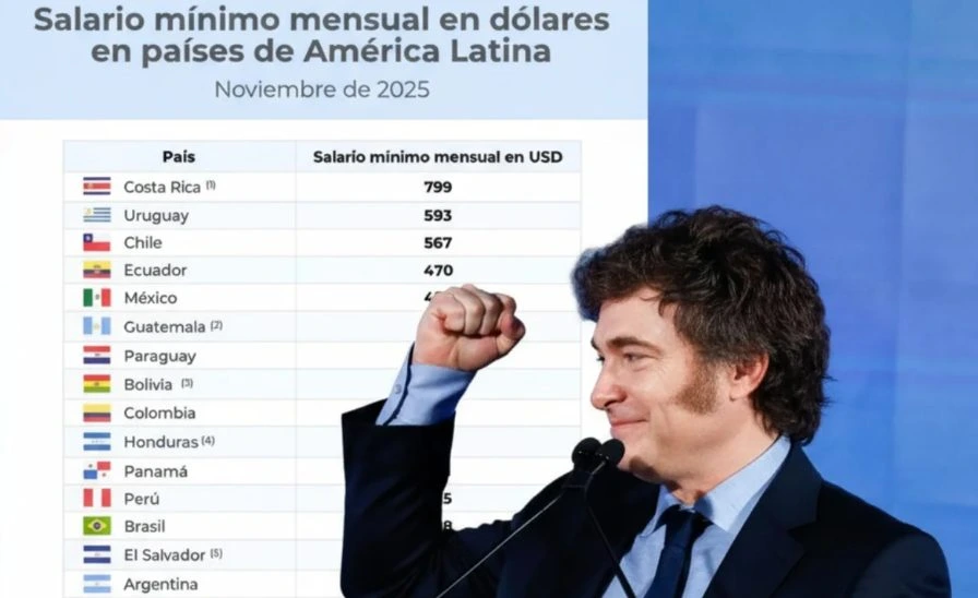 En la Casa Rosada admiten que el gobierno de Javier Milei usó el ingreso de los trabajadores como “ancla del ajuste y la desaceleración de la inflación”. Y los números lo confirman: el Celag reveló que, actualizado a noviembre de 2025, el salario mínimo argentino es el más bajo de toda la región. Con apenas 225 dólares, se ubica en el fondo de la tabla, por debajo de Bolivia, Paraguay y muy lejos de Costa Rica, que lidera con 729 dólares.