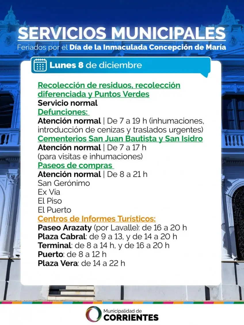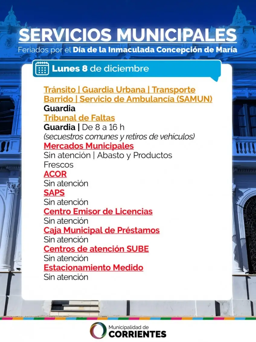 En síntesis, el feriado del 8 de diciembre implicará un funcionamiento reducido o diferenciado en gran parte de los servicios del NEA, por lo que se recomienda a los vecinos planificar trámites y gestiones para evitar contratiempos.