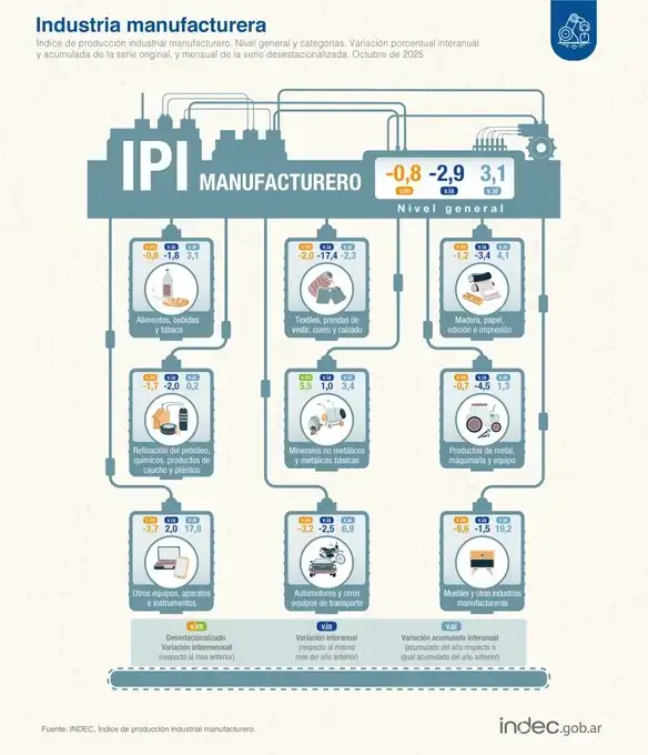 Este repunte anual debe leerse con cautela: la base de comparación es muy baja, dado que la construcción había sufrido una fuerte caída en 2024, lo que amplifica las variaciones positivas actuales. En paralelo, el Índice de Producción Industrial (IPI manufacturero) retrocedió 0,8% en la comparación mensual y marcó una caída del 2,9% interanual. Aun así, el sector conserva un incremento del 3,1% en el acumulado de los primeros diez meses del año.