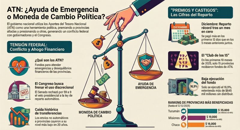 En plena convocatoria a sesiones extraordinarias y con el Congreso atravesando una de las semanas más frenéticas del año, el Gobierno nacional volvió a activar una herramienta tan sensible como cuestionada: la distribución discrecional de los Aportes del Tesoro Nacional (ATN). Según datos aportados por una consultora privada especializada en finanzas públicas, en lo que va de diciembre la Casa Rosada ya giró $43.000 millones a gobernadores aliados, en un movimiento que coincide milimétricamente con la discusión del Presupuesto 2026 y el arranque del debate de la reforma laboral, uno de los proyectos más resistidos por sindicatos y sectores de la oposición.