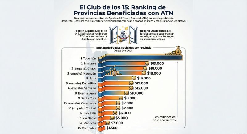 El principal beneficiario de este esquema es el gobernador de Tucumán, Osvaldo Jaldo, que acumula $35.000 millones en ATN a lo largo de 2025, consolidándose como el gran ganador del año. No se trata de un dato aislado: Tucumán lidera cómodamente el ranking de provincias receptoras, en paralelo a su rol como aliado clave del oficialismo para ordenar apoyos legislativos en ambas cámaras. Detrás aparecen Misiones, Chaco y Neuquén, completando un mapa de beneficiarios que coincide llamativamente con los distritos que acompañaron al Gobierno en votaciones sensibles.