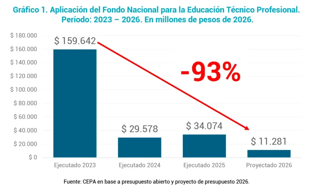 El caso más extremo es el del Fondo Nacional para la Educación Técnico Profesional (FoNETP). Según el CEPA, el presupuesto proyectado para 2026 implica una caída acumulada del 93% respecto de lo ejecutado en 2023.