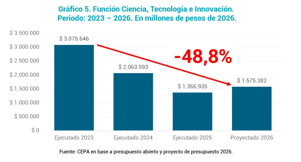El sector científico tampoco escapa al ajuste. La función Ciencia, Tecnología e Innovación sufrirá una merma real del 48,8% respecto a lo ejecutado en 2023, profundizando el deterioro del sistema científico y tecnológico nacional.