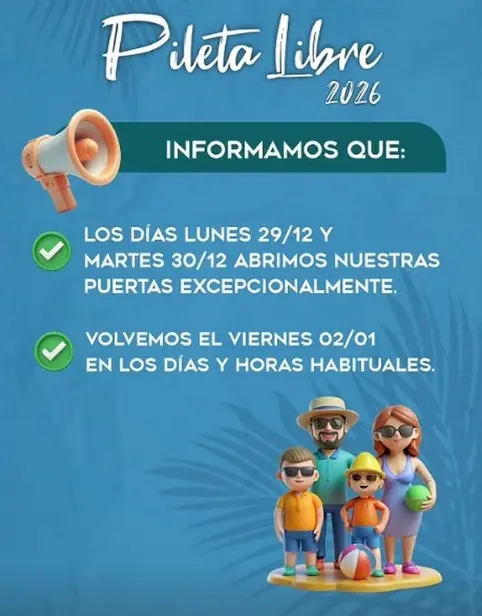 La actividad se reanudará plenamente el viernes 2 de enero, retomando sus días y horarios habituales de funcionamiento para que la comunidad pueda comenzar el 2026 disfrutando de las piletas y los juegos acuáticos. Los días habituales son de miércoles a domingo.