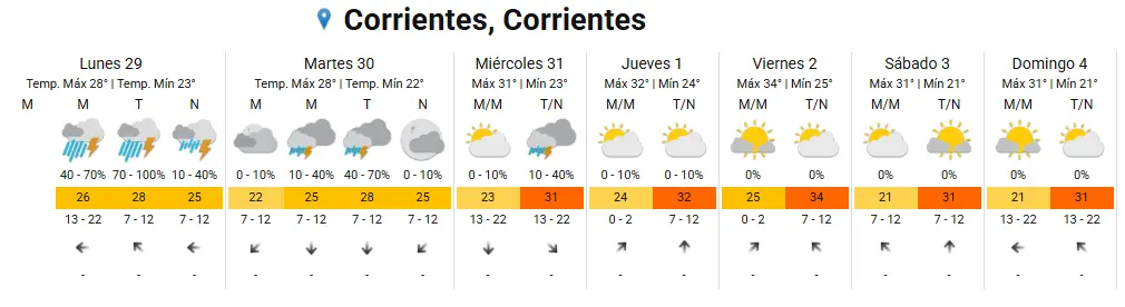 En la ciudad de Formosa hay entre un 10 y 40% de probabilidad de lluvia tanto para la mañana como la tarde y noche, aunque se espera que solo haya chaparrones y no las tormentas como ocurrieron durante el inicio de la semana. En cuanto a la temperatura se espera que haya una mínima de 23 grados y una máxima de 33.