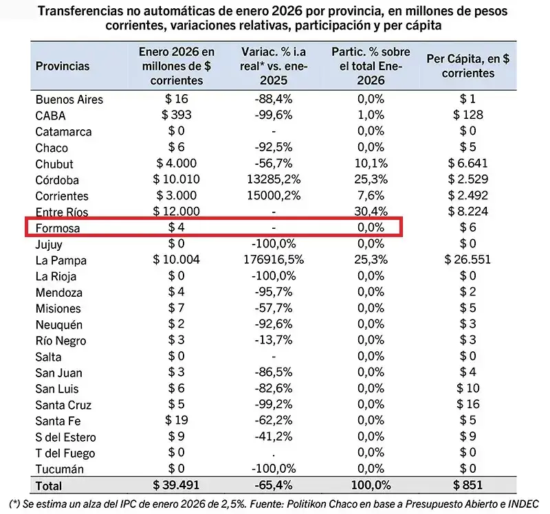 El inicio del año 2026 ha marcado un hito de austeridad extrema para las arcas provinciales. Según los últimos informes sobre transferencias no automáticas del Gobierno nacional, la provincia de Formosa recibió apenas $4 millones durante el mes de enero. Esta cifra, en términos estadísticos, sitúa al distrito en una posición marginal, habiendo captado prácticamente el 0% del total de los recursos distribuidos discrecionalmente entre las 24 jurisdicciones del país.