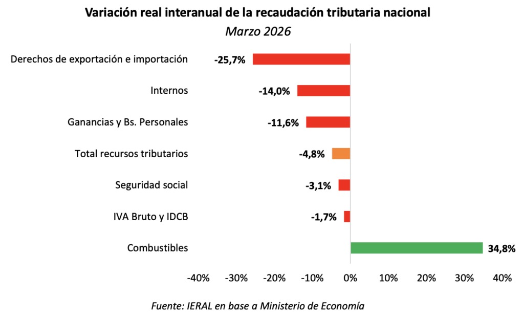 Lo que genera aún más tensión es lo que ocurre con los impuestos directamente ligados al pulso de la economía y del mercado laboral. En marzo, la recaudación conjunta del IVA y del impuesto a los débitos y créditos bancarios (IDCB) cayó 1,7% en términos reales, mientras que en el acumulado del primer trimestre la baja se profundiza hasta el 8,7%. En paralelo, los aportes y contribuciones a la seguridad social también muestran un deterioro: retrocedieron 3,1% en el mes y 4% en el trimestre.
