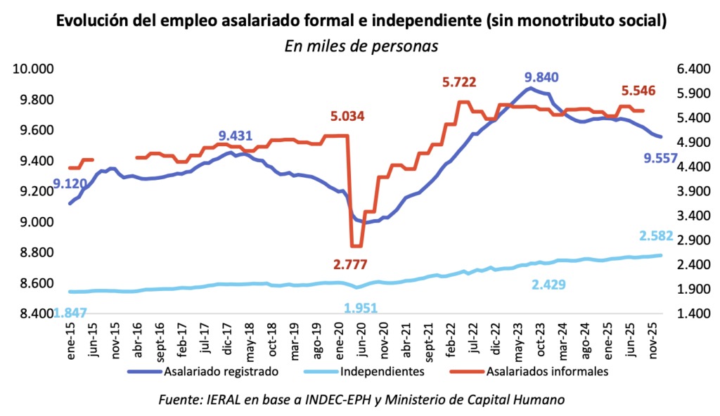 En el caso de la seguridad social, la caída responde a un mercado laboral más debilitado. Desde noviembre de 2023 se perdieron alrededor de 283 mil puestos de trabajo asalariados formales, tanto en el sector público como en el privado. Al mismo tiempo, creció en unas 158 mil personas el número de monotributistas, una categoría que aporta menos al sistema que el empleo registrado tradicional.