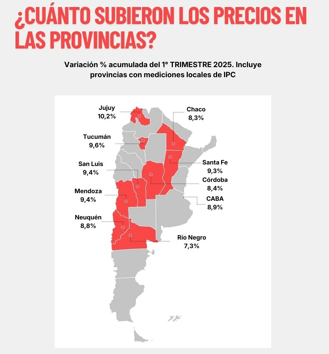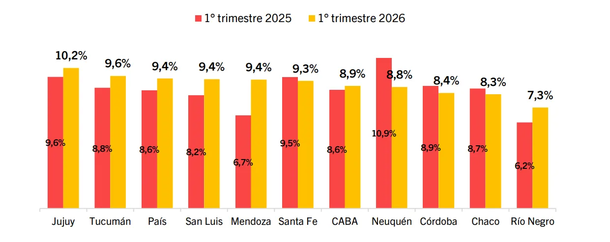 En el acumulado del primer trimestre de 2026, Jujuy (10,2%) y Tucumán (9,6%) encabezan la lista de los distritos más castigados, superando el promedio país. Por el contrario, Río Negro se ubicó en el extremo opuesto con un 7,3%.