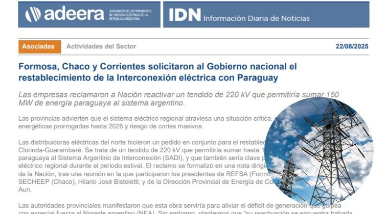 ADEERA se hizo eco del reclamo de Formosa, Chaco y Corrientes para restablecer la Interconexión Clorinda-Guarambaré